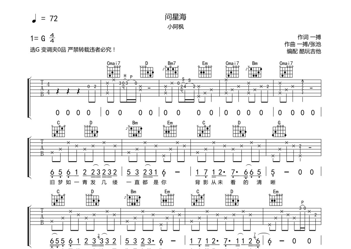 小阿枫《问星海》吉他谱 - G调弹唱六线谱