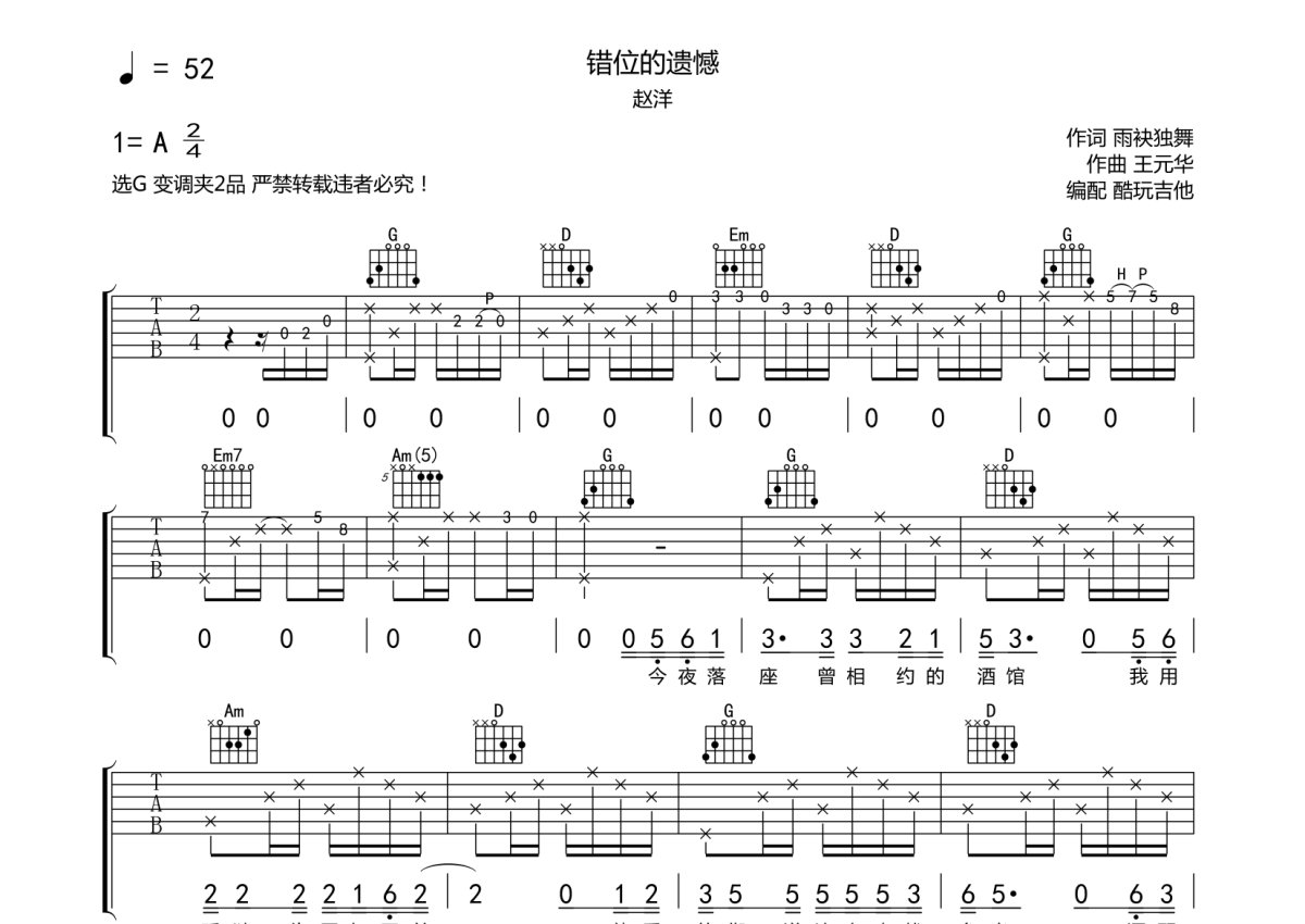 赵洋《错位的遗憾》吉他谱 - G调弹唱六线谱