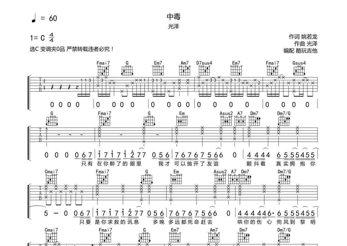 王泓昊《中毒》吉他谱 - C调弹唱六线谱