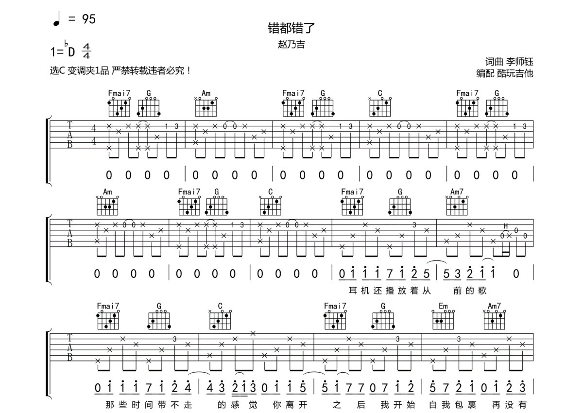 《错都错了》是赵乃吉演唱的一首歌曲,本吉他谱采用的是C调指法编配,这份吉他谱共有三张高清图谱,图谱由 @酷玩吉他 编配上传,图谱使用六线谱编配,包含吉他和弦指法、简谱以及歌词部分,曲谱配备了相关的音频提供试听,使用这份错都错了吉他谱,可以让你更加方便地掌握这首歌曲的弹唱技巧,快来尝试吧。赵乃吉《错都错了》吉他谱_C调吉他弹唱谱。