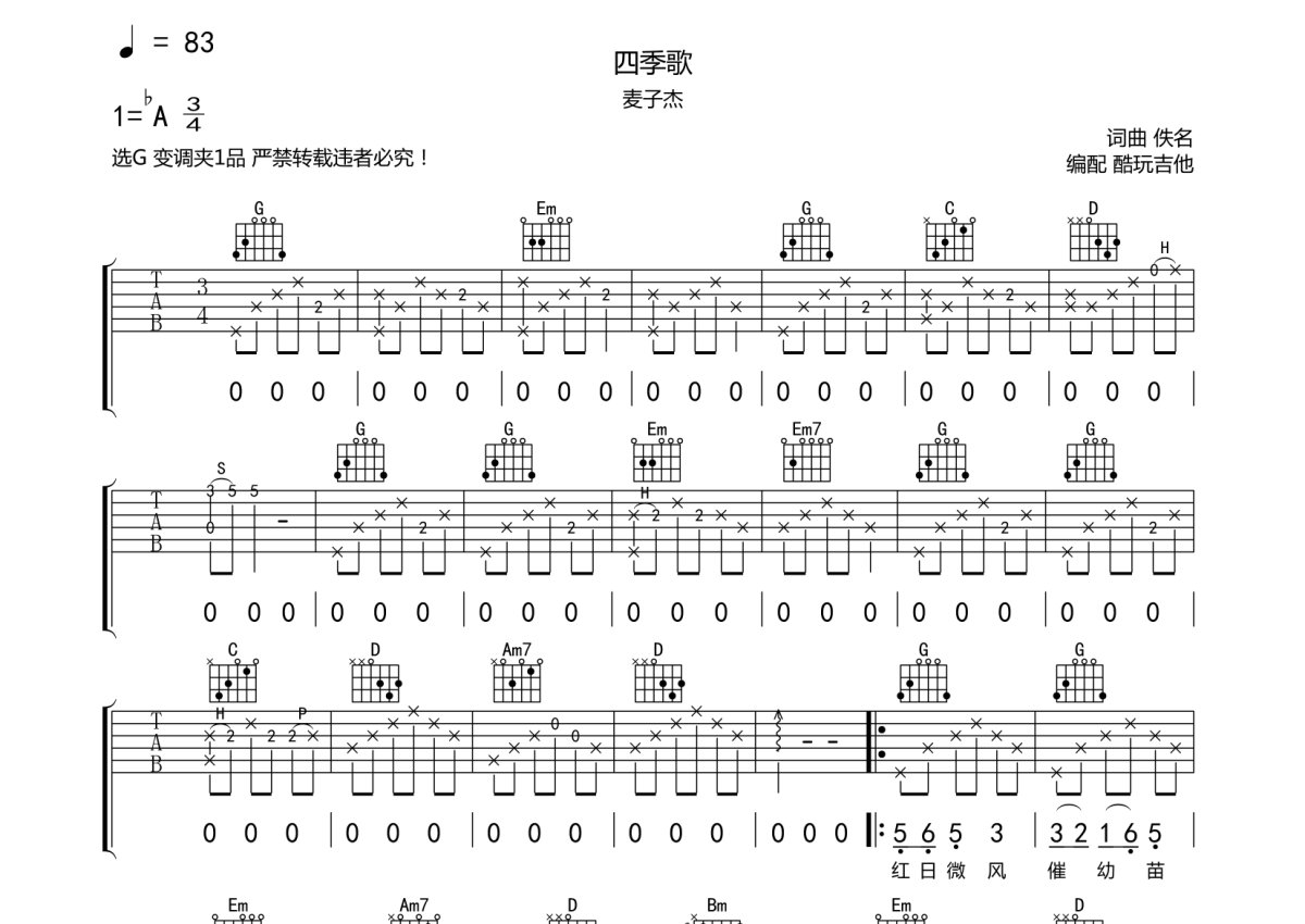 麦子杰《四季歌》吉他谱 - G调弹唱六线谱