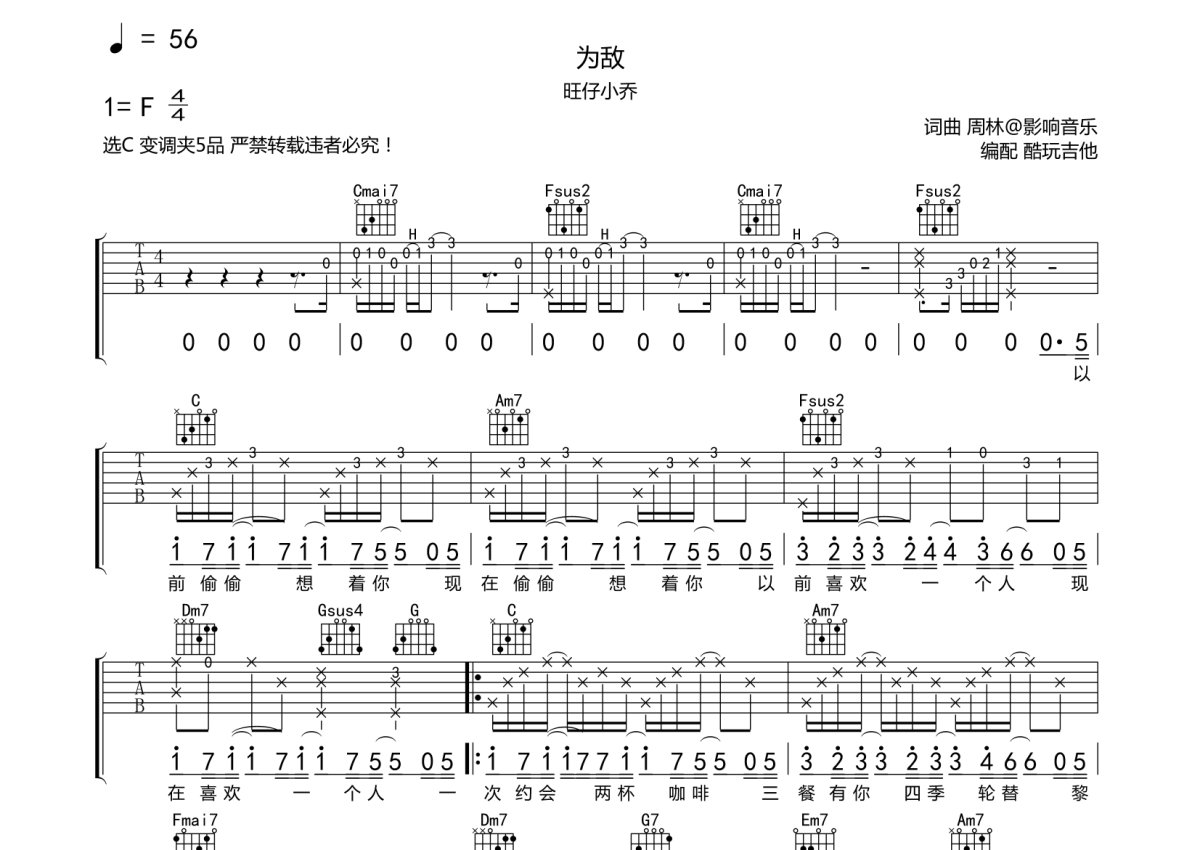 旺仔小乔《为敌》吉他谱 - C调弹唱六线谱