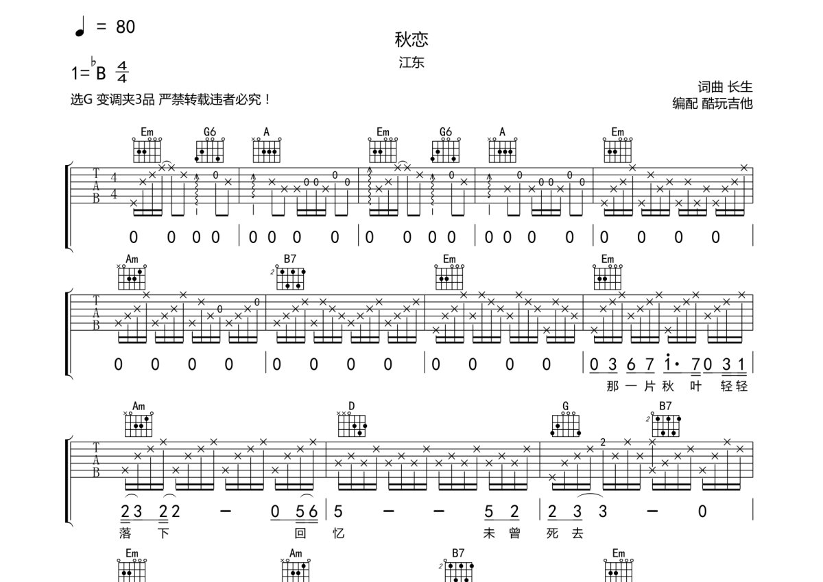 江东《秋恋》吉他谱 - G调弹唱六线谱