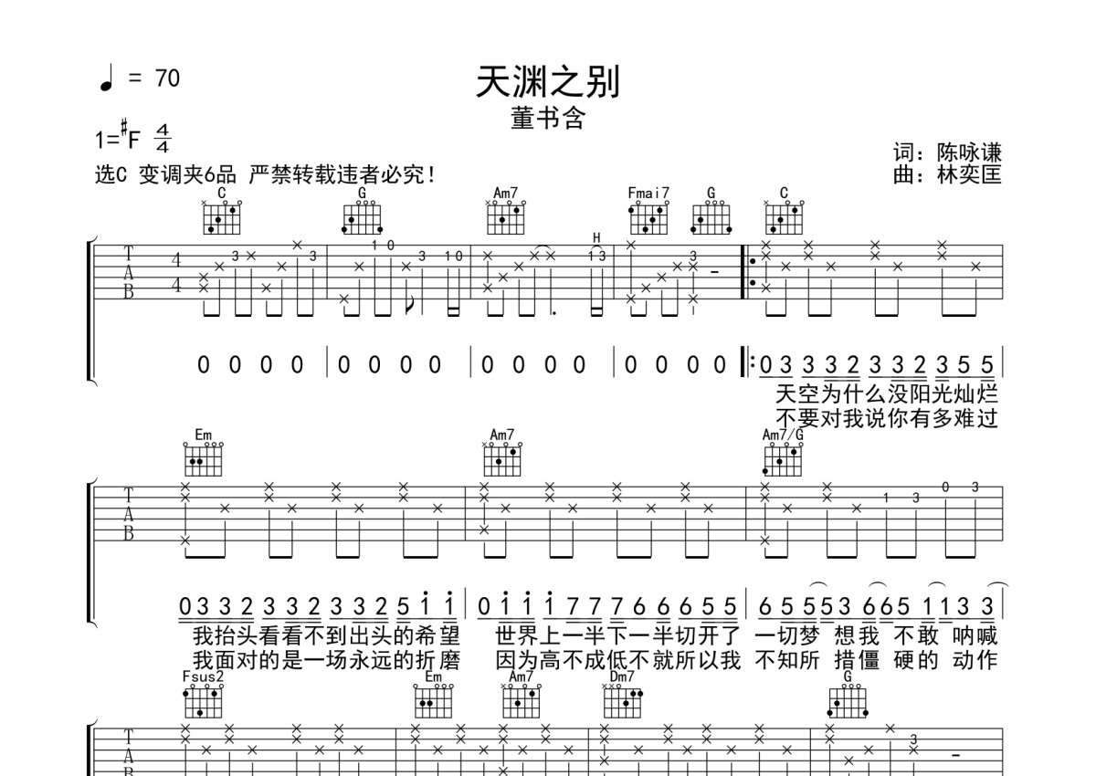 董书含《天渊之别》吉他谱 - C调弹唱六线谱