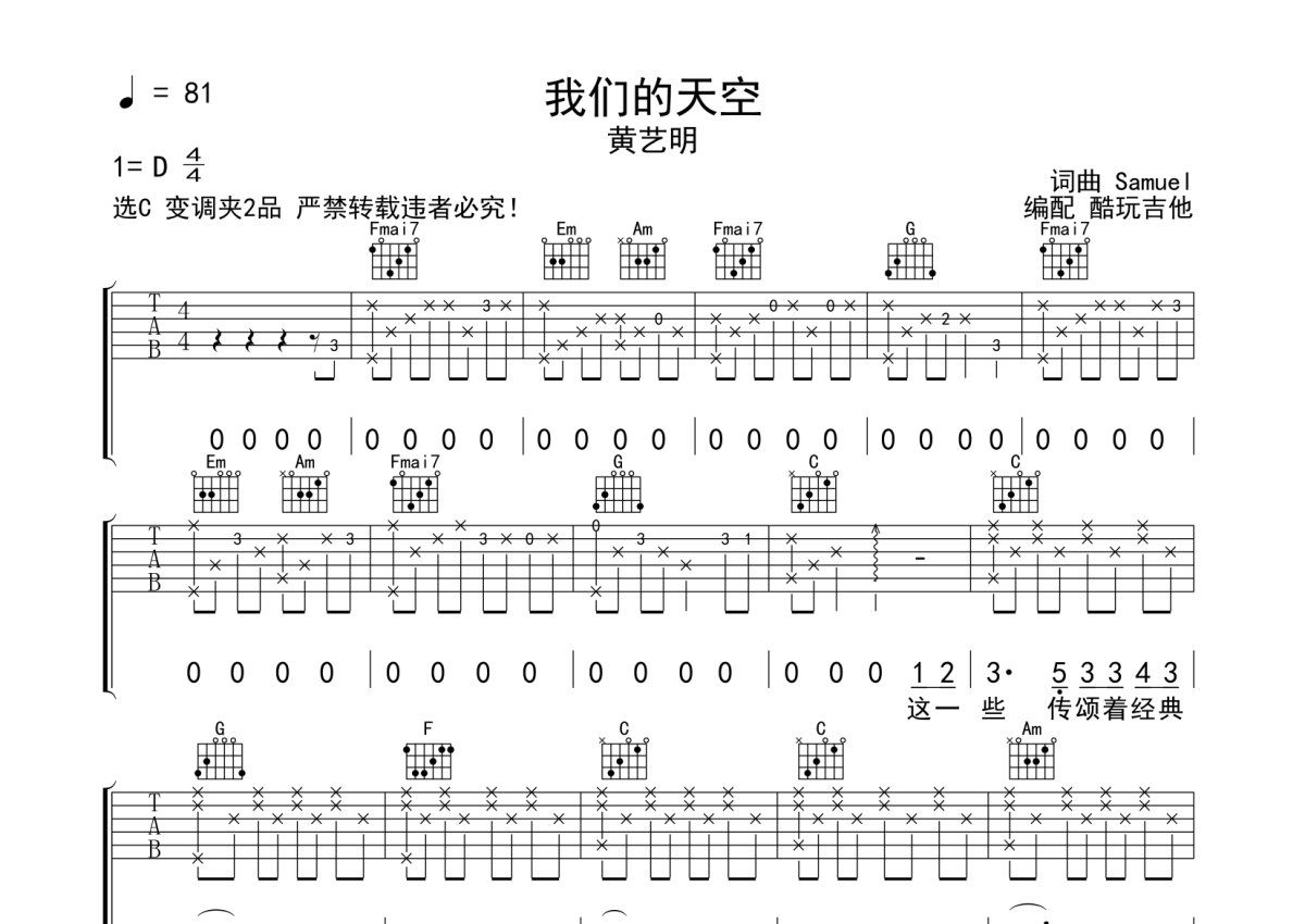 黄艺明《我们的天空》吉他谱 - C调弹唱六线谱