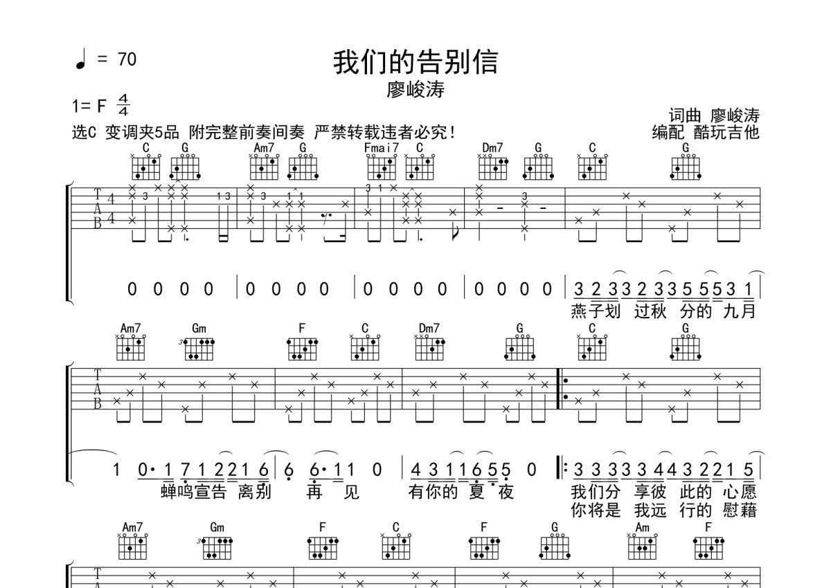 廖峻涛《我们的告别信》吉他谱 - C调弹唱六线谱