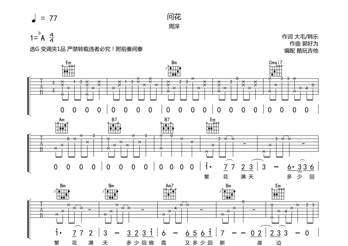 《问花》是周深演唱的一首歌曲,前奏间奏,本吉他谱采用的是G调指法编配,这份吉他谱共有三张高清图谱,图谱由 @酷玩吉他 编配上传,图谱使用六线谱编配,包含吉他和弦指法、简谱以及歌词部分,曲谱配备了相关的音频提供试听,使用这份问花吉他谱,可以让你更加方便地掌握这首歌曲的弹唱技巧,快来尝试吧。周深《问花》吉他谱_G调吉他弹唱谱_前奏间奏。