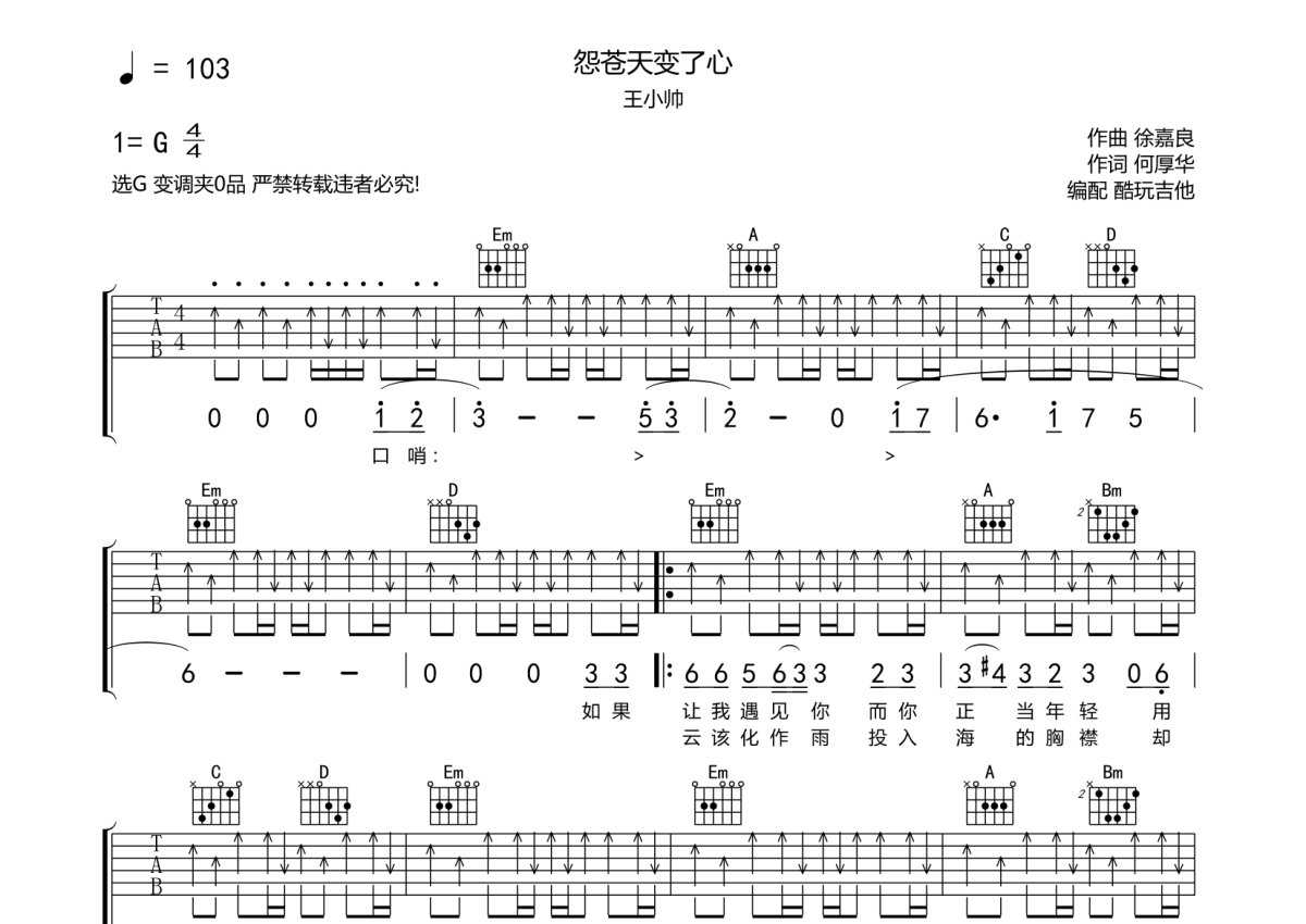 王小帅《怨苍天变了心》吉他谱 - G调弹唱六线谱
