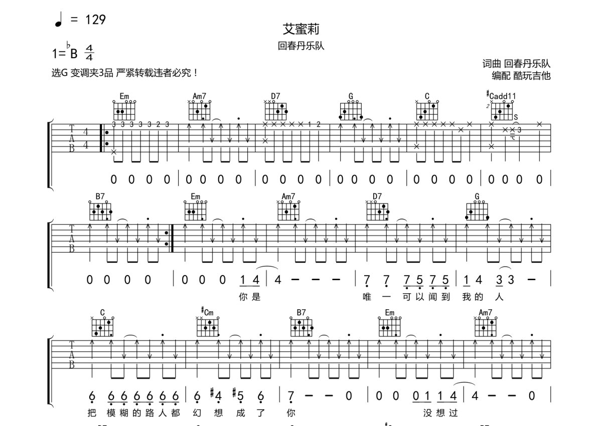 回春丹乐队《艾蜜莉》吉他谱 - G调弹唱六线谱 - 完整前奏间奏尾奏