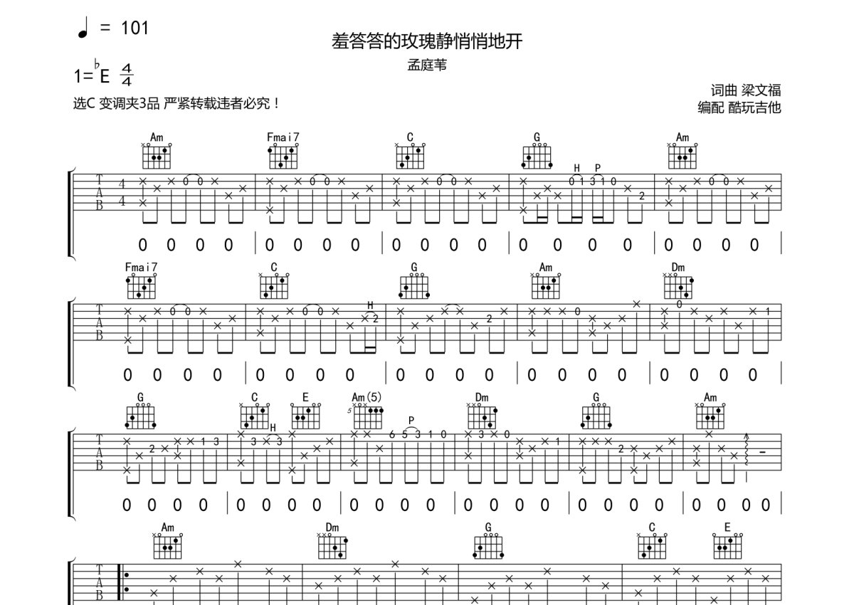孟庭苇《羞答答的玫瑰静悄悄地开》吉他谱 - C调弹唱六线谱