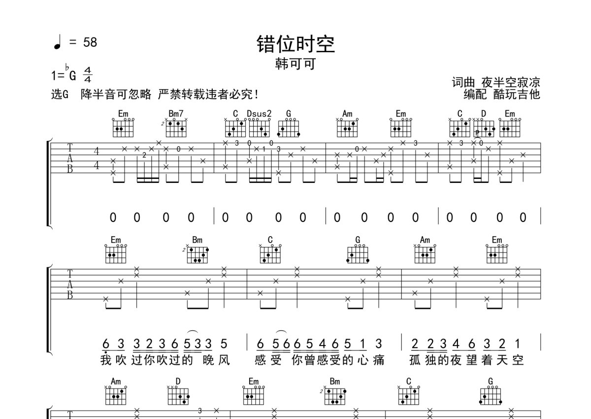 韩可可《错位时空》吉他谱 - G调弹唱六线谱