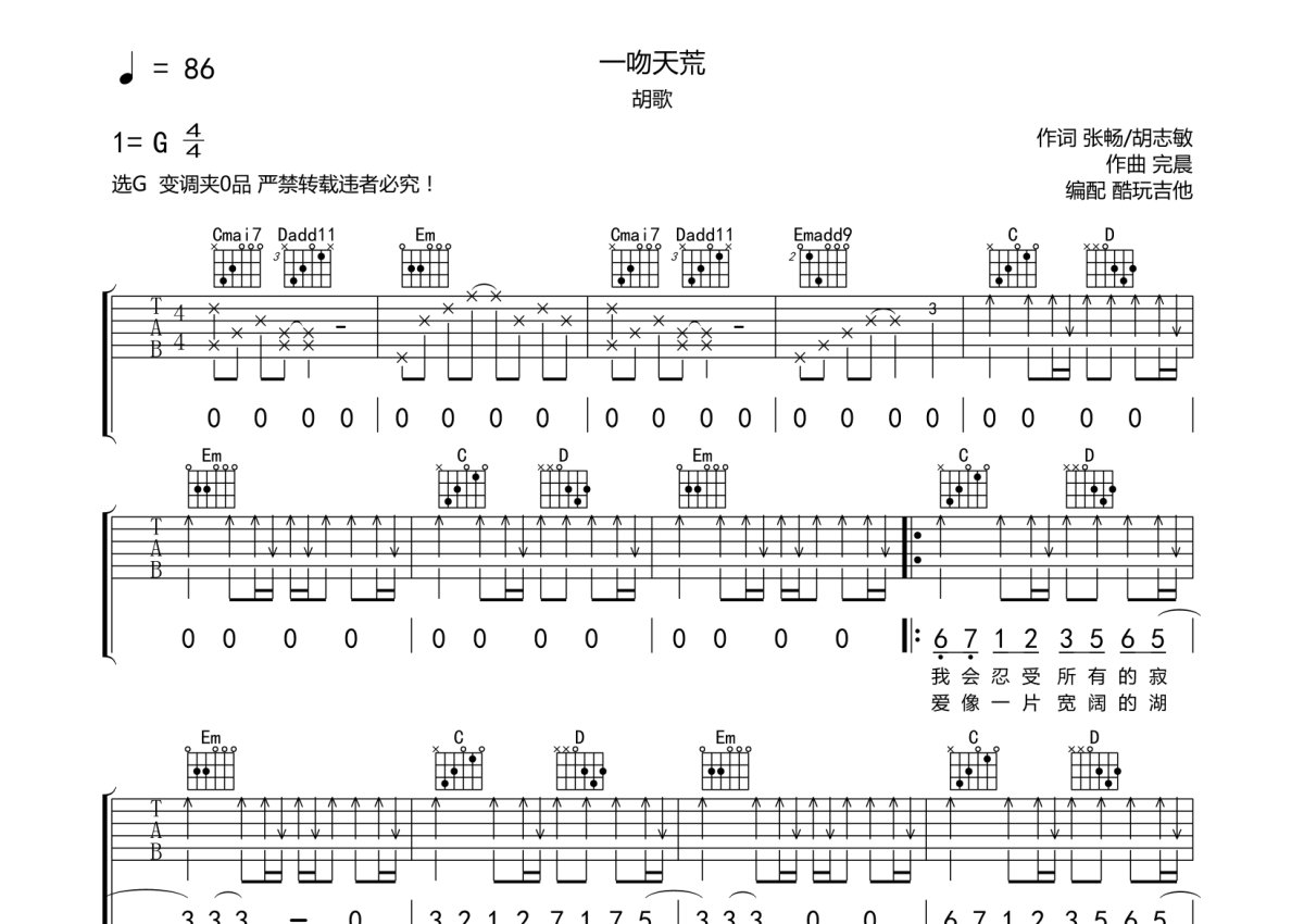 《一吻天荒》是胡歌演唱的一首歌曲,本吉他谱采用的是G调指法编配,这份吉他谱共有三张高清图谱,图谱由 @酷玩吉他 编配上传,图谱使用六线谱编配,包含吉他和弦指法、简谱以及歌词部分,曲谱配备了相关的音频提供试听,使用这份一吻天荒吉他谱,可以让你更加方便地掌握这首歌曲的弹唱技巧,快来尝试吧。胡歌《一吻天荒》吉他谱_G调吉他弹唱谱。