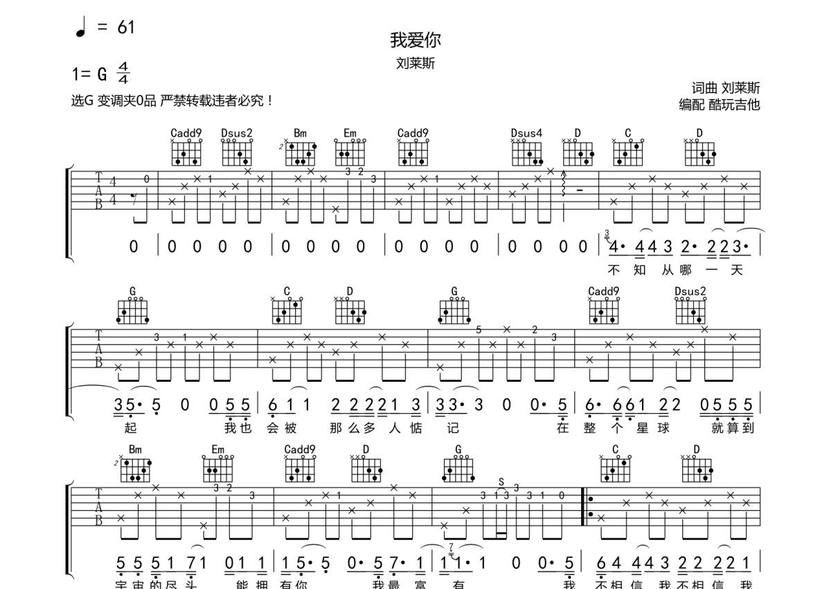 刘莱斯《我爱你》吉他谱 - G调弹唱六线谱