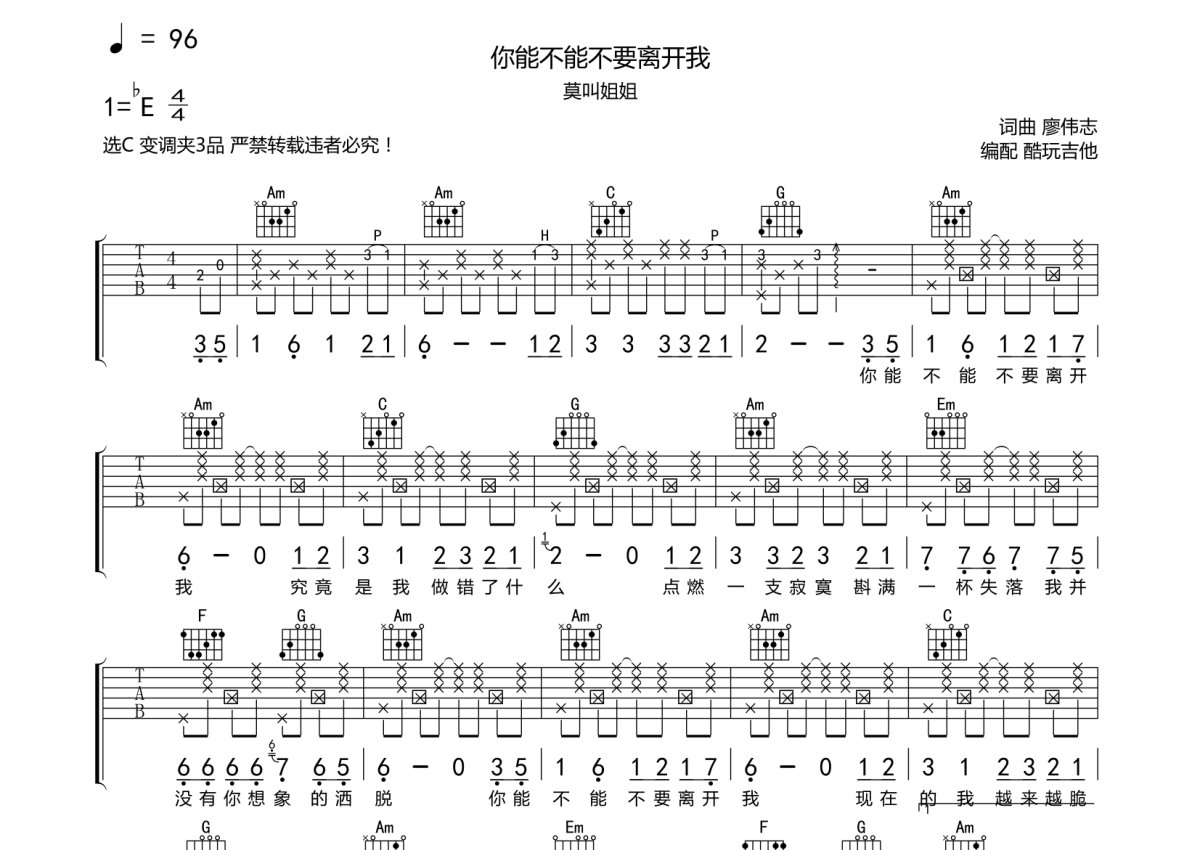 莫叫姐姐《你能不能不要离开我》吉他谱 - C调弹唱六线谱