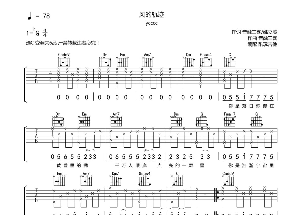 ycccc《风的轨迹》吉他谱 - C调弹唱六线谱