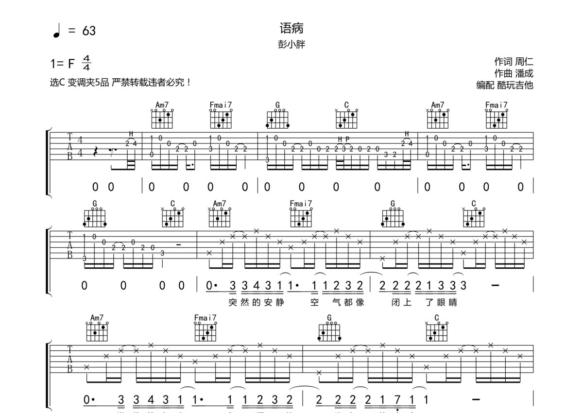彭小胖《语病》吉他谱 - C调弹唱六线谱