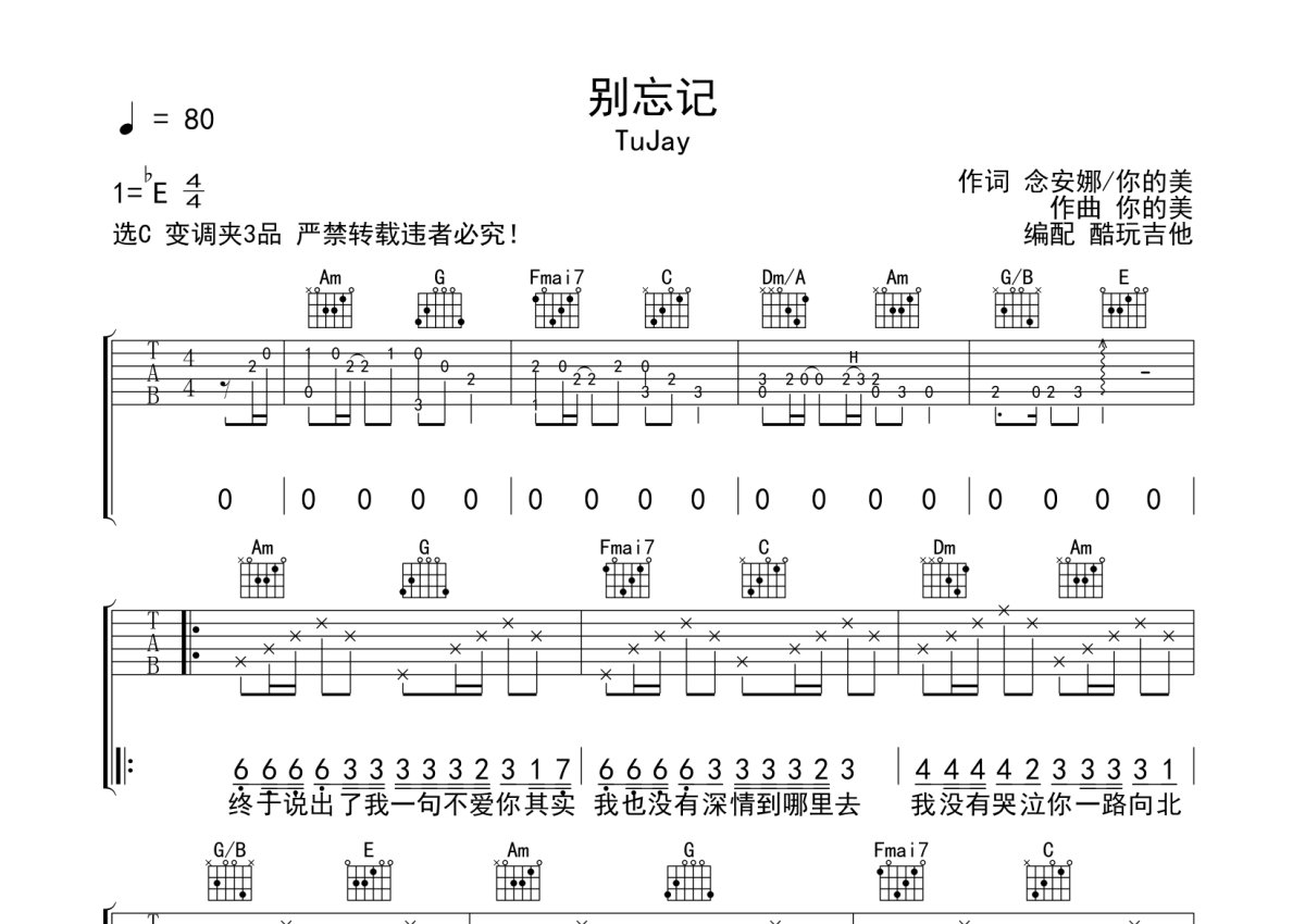 TuJay《别忘记》吉他谱 - C调弹唱六线谱