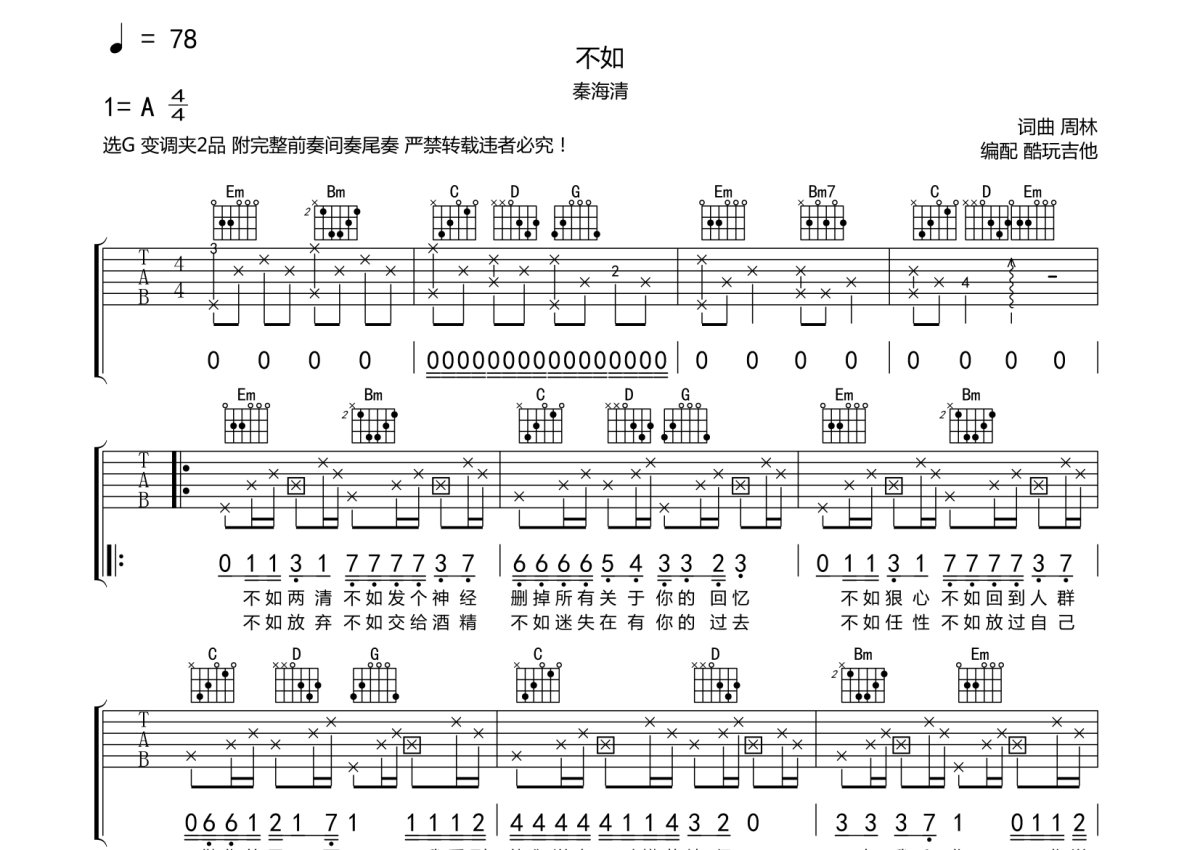 秦海清《不如》吉他谱 - G调弹唱六线谱