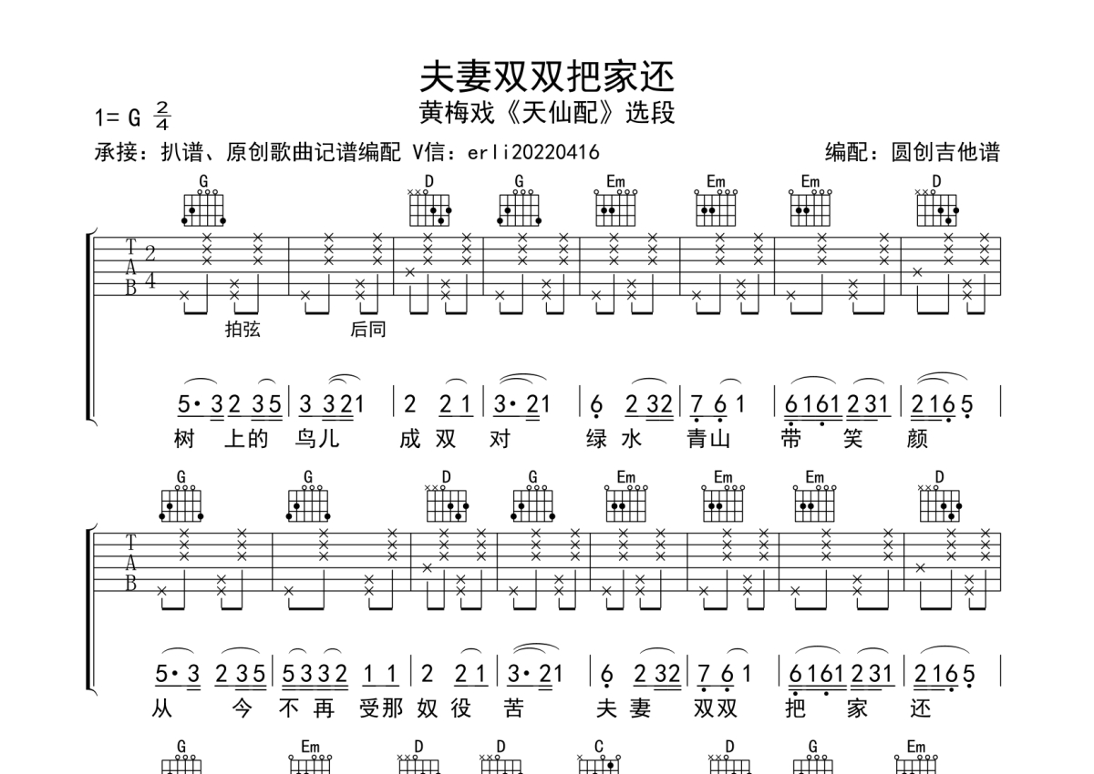 黄梅戏选段《夫妻双双把家还》吉他谱 - G调弹唱六线谱 - 拍弦版