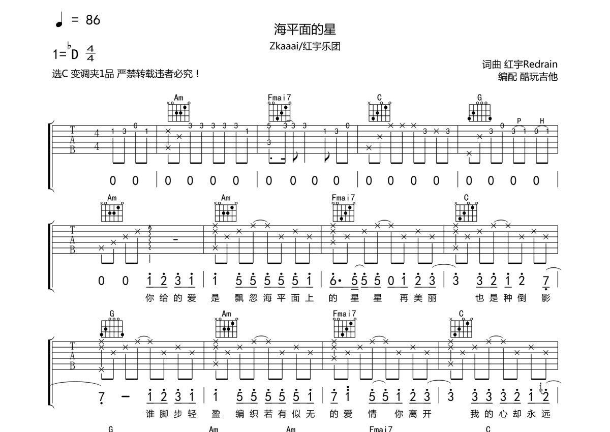 ZKaaai/红宇乐团《海平面的星》吉他谱 - C调弹唱六线谱