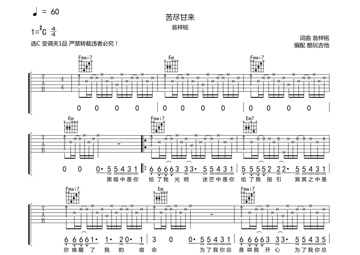 翁梓铭《苦尽甘来》吉他谱 - C调弹唱六线谱