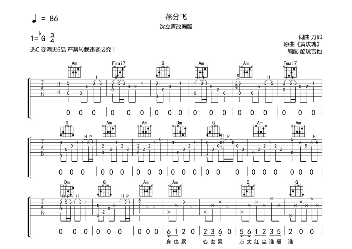 沈立青《燕分飞》吉他谱 - C调弹唱六线谱 - 改编版