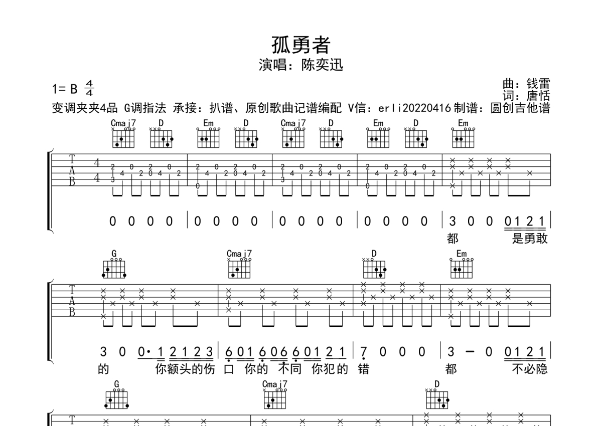 《孤勇者》是陈奕迅演唱的一首歌曲,原版编配,本吉他谱采用的是G调指法编配,这份吉他谱共有四张高清图谱,图谱由 @圆创吉他谱 编配上传,图谱使用六线谱编配,包含吉他和弦指法、简谱以及歌词部分,使用这份孤勇者吉他谱,可以让你更加方便地掌握这首歌曲的弹唱技巧,快来尝试吧。经典歌曲 G调指法编配 适合所以吉他弹出爱好者。