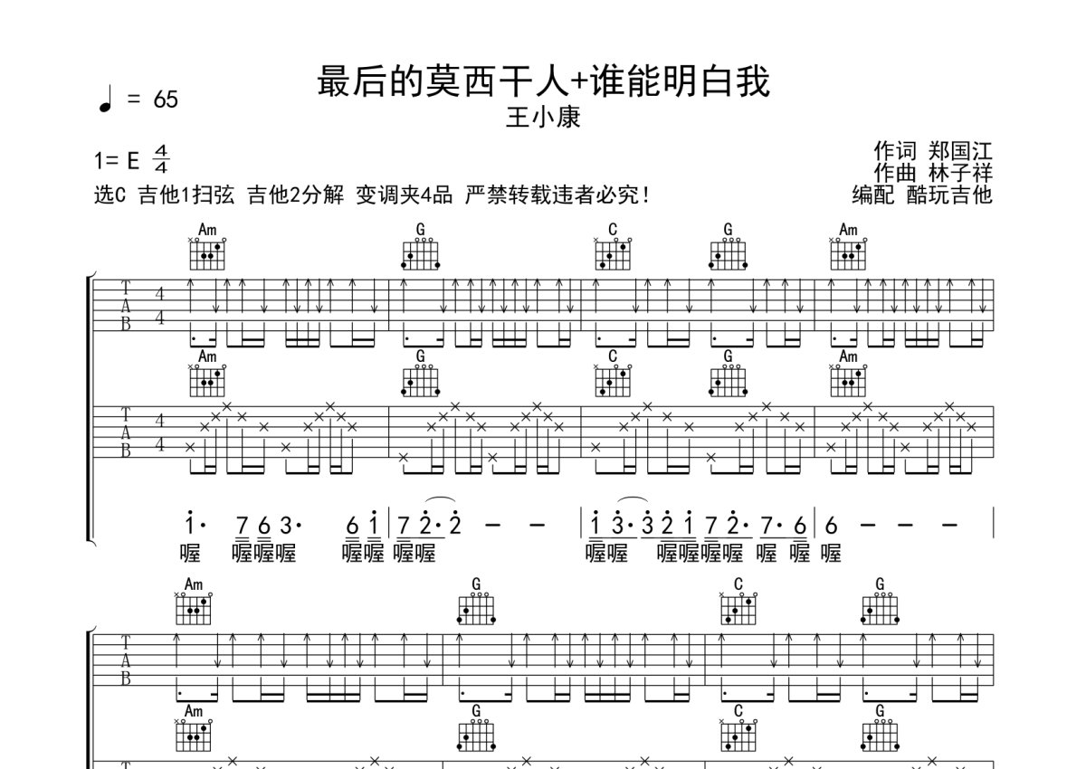 王小康《最后的莫西干人+谁能明白我》吉他谱 - C调弹唱六线谱
