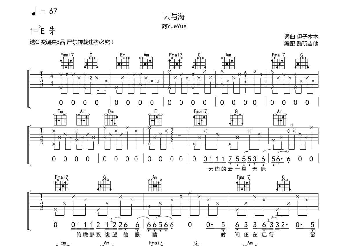阿yueyue《云与海》吉他谱 - C调弹唱六线谱
