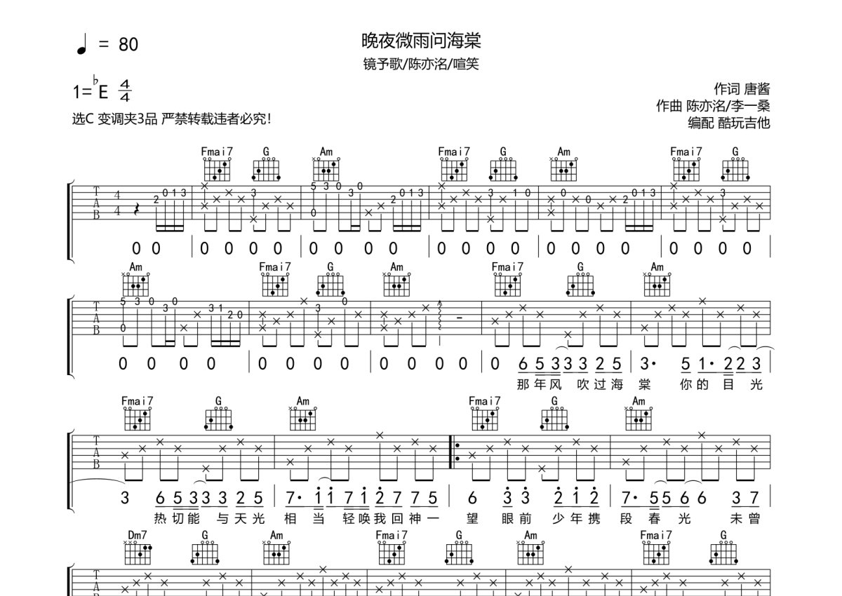 镜予歌/陈亦洺《晚夜微雨问海棠》吉他谱 - C调弹唱六线谱