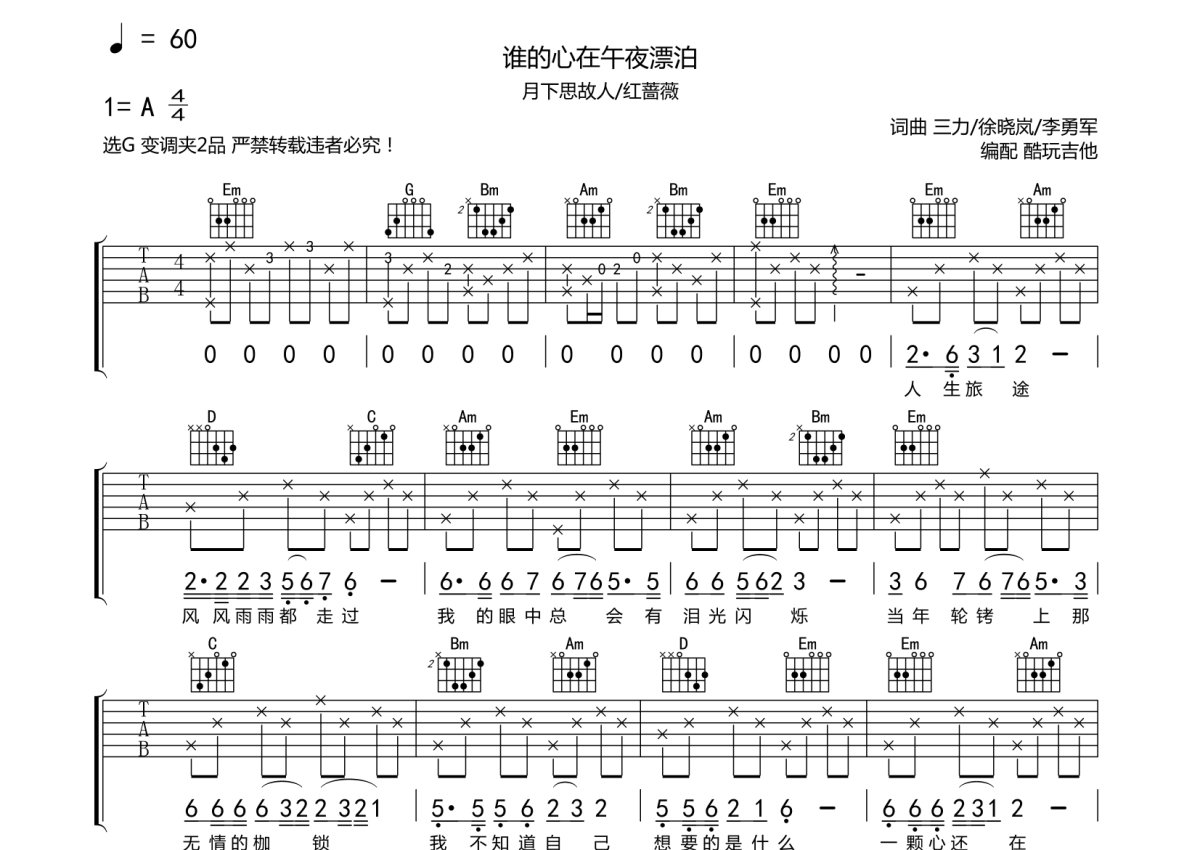 月下思故人《谁的心在午夜漂泊》吉他谱 - G调弹唱六线谱