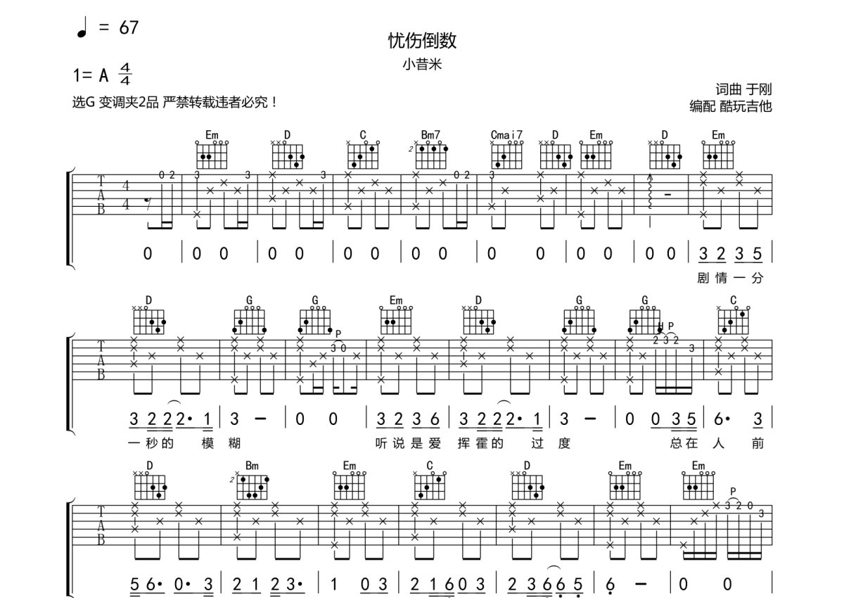 小昔米《忧伤倒数》吉他谱 - G调弹唱六线谱