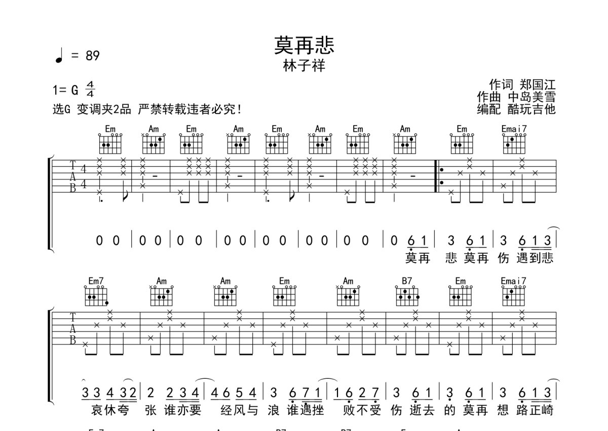 林子祥《莫再悲》吉他谱 - G调弹唱六线谱