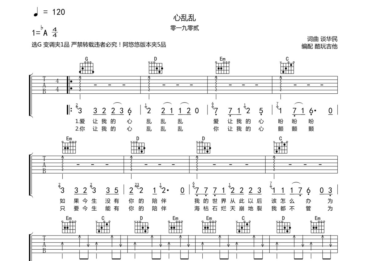 零一九零贰《心乱乱》吉他谱 - G调弹唱六线谱