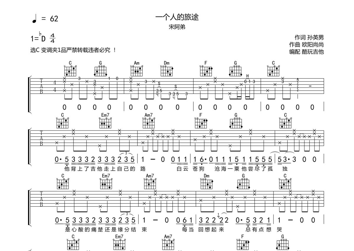 来阿弟《一个人的旅途》吉他谱 - C调弹唱六线谱
