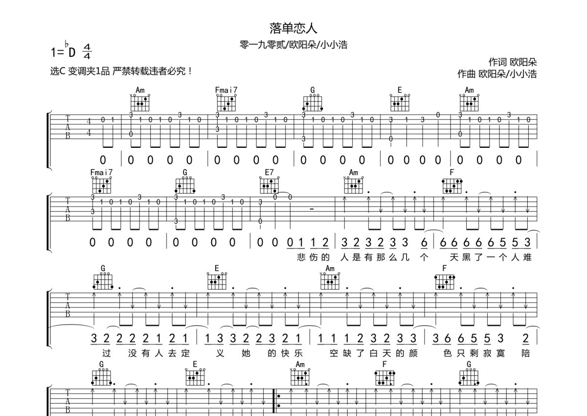 零一九零贰《落单恋人》吉他谱 - C调弹唱六线谱