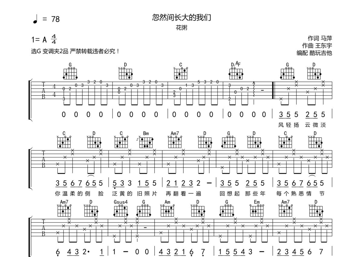 花粥《忽然间长大的我们》吉他谱 - G调弹唱六线谱