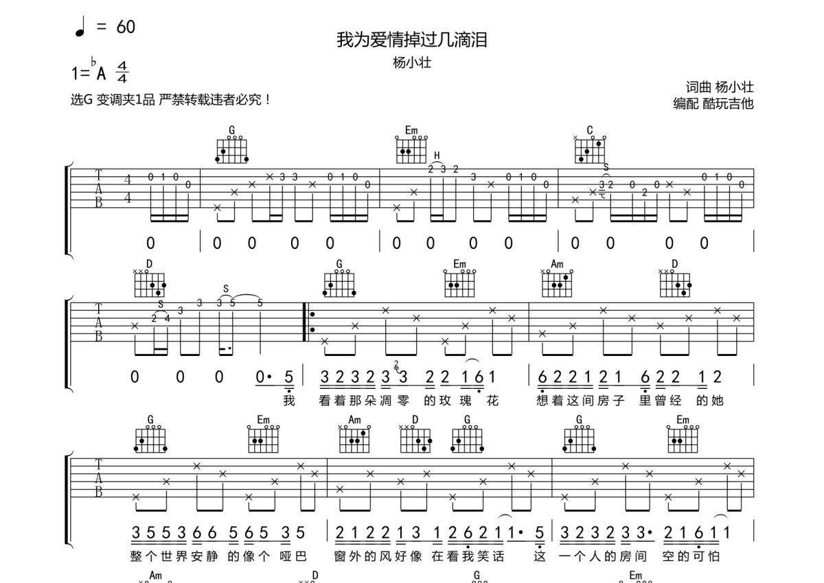 杨小壮《我为爱情掉过几滴泪》吉他谱 - G调弹唱六线谱