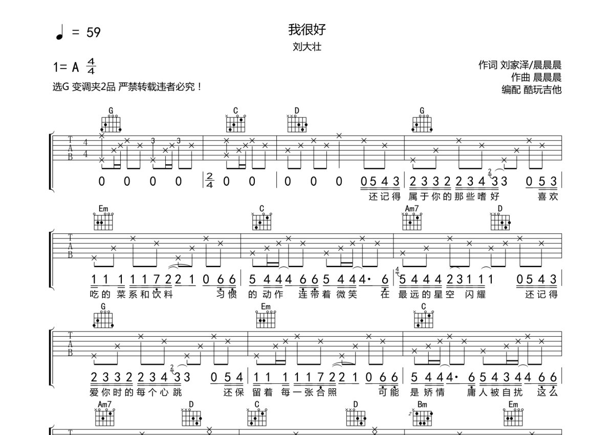 刘大壮《我很好》吉他谱 - G调弹唱六线谱