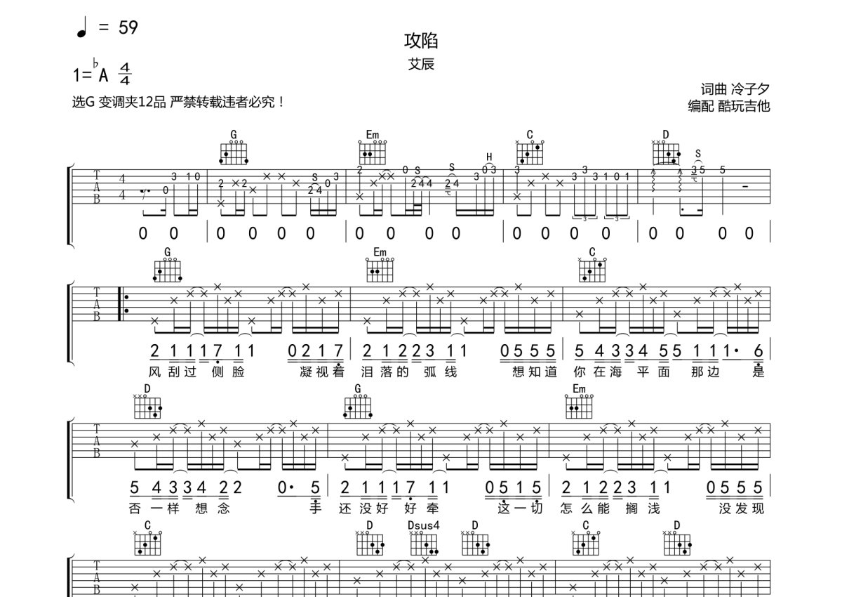艾辰《攻陷》吉他谱 - G调弹唱六线谱
