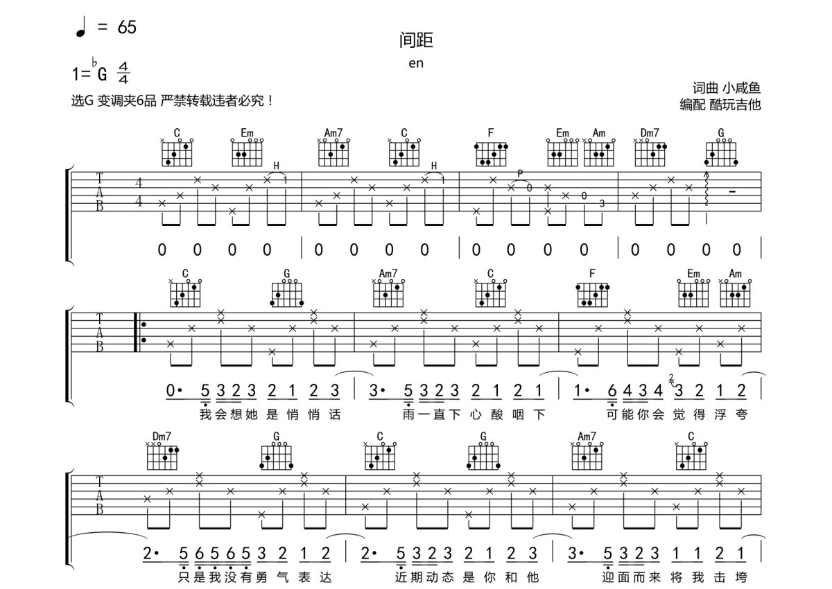《间距》是en演唱的一首歌曲,本吉他谱采用的是G调指法编配,这份吉他谱共有两张高清图谱,图谱由 @酷玩吉他 编配上传,图谱使用六线谱编配,包含吉他和弦指法、简谱以及歌词部分,使用这份间距吉他谱,可以让你更加方便地掌握这首歌曲的弹唱技巧,快来尝试吧。en《间距》吉他谱_G调吉他弹唱谱。