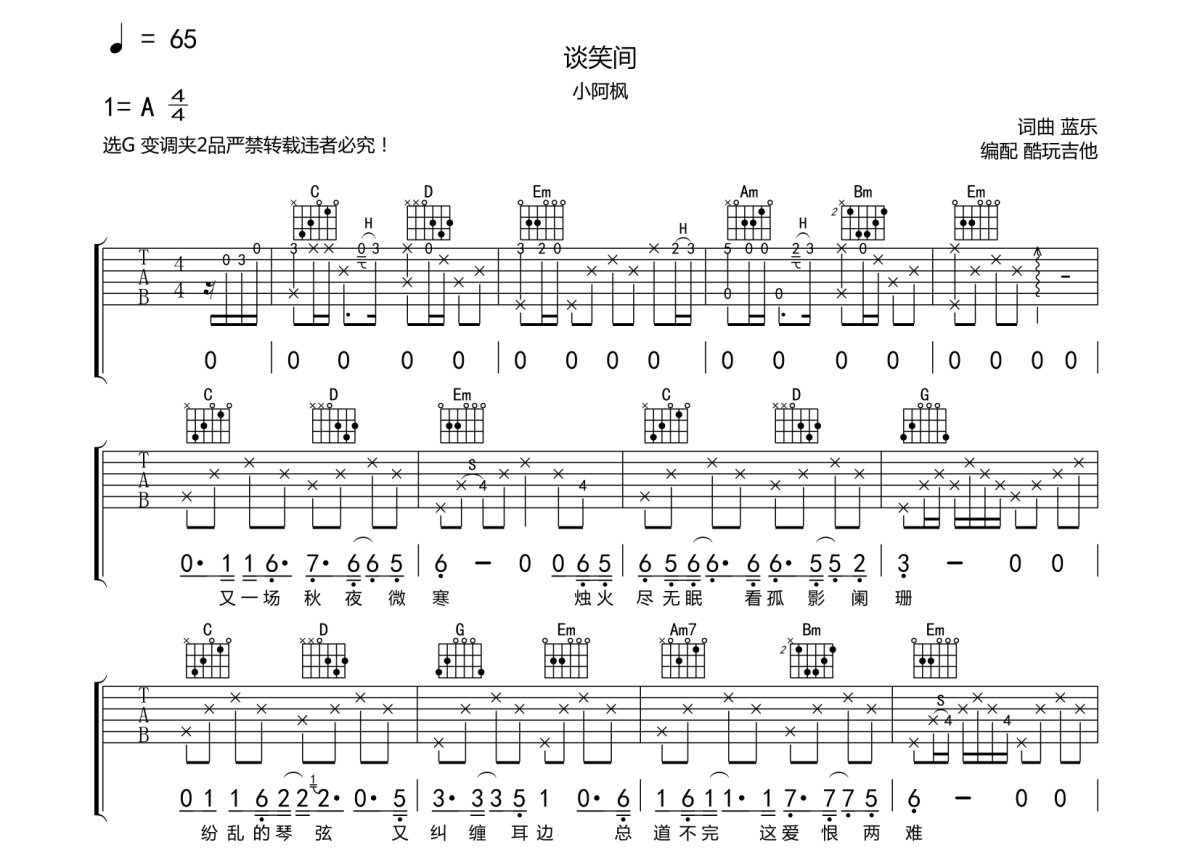 小阿枫《谈笑间》吉他谱 - G调弹唱六线谱