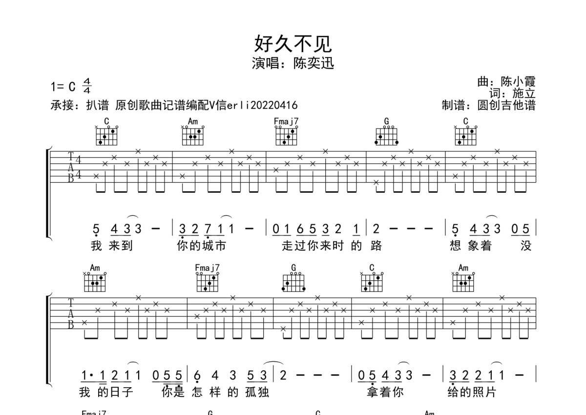 陈奕迅《好久不见》吉他谱 - C调弹唱六线谱 - 分解节奏型简单编配