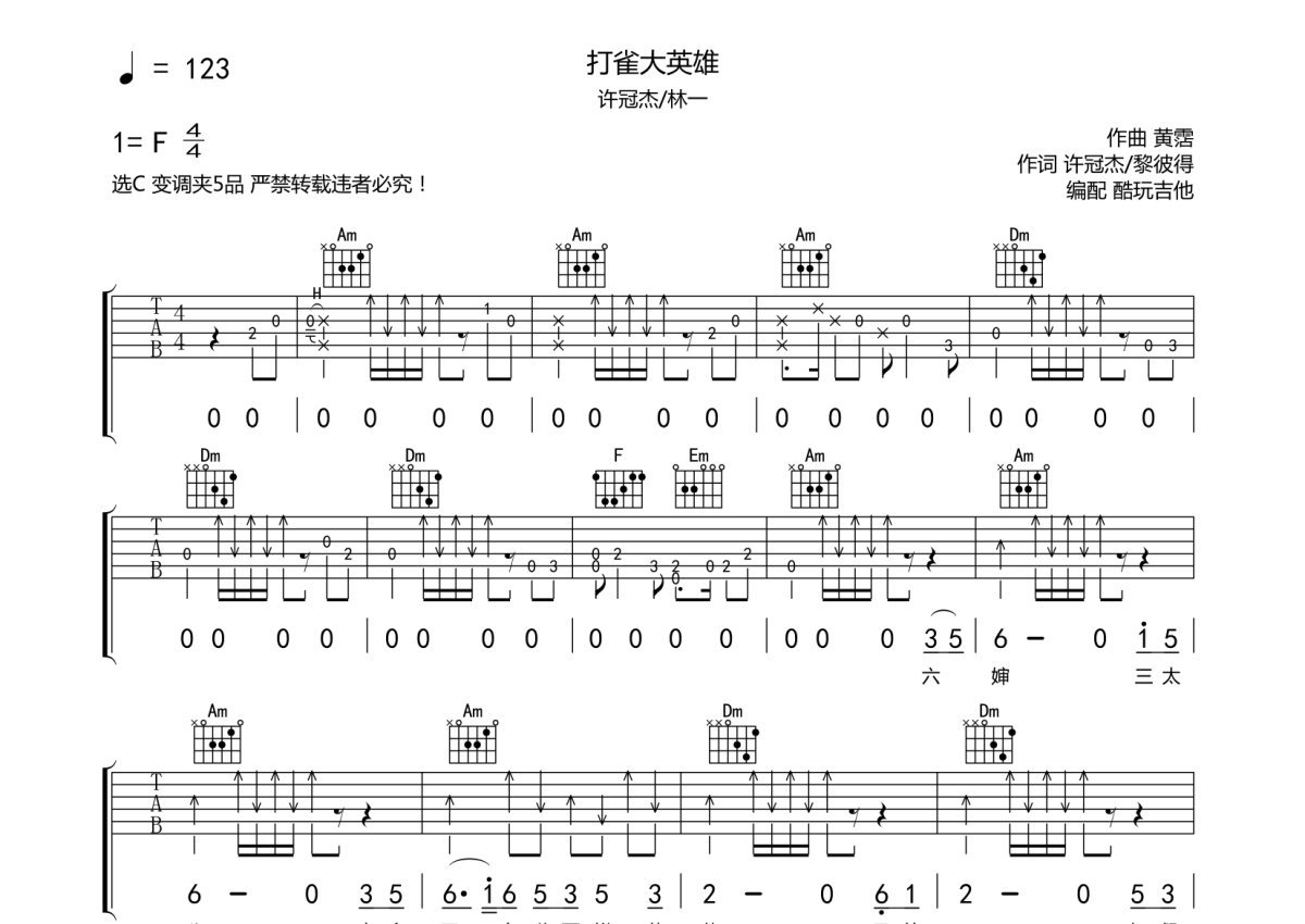 许冠杰/林一《打雀大英雄》吉他谱 - C调弹唱六线谱
