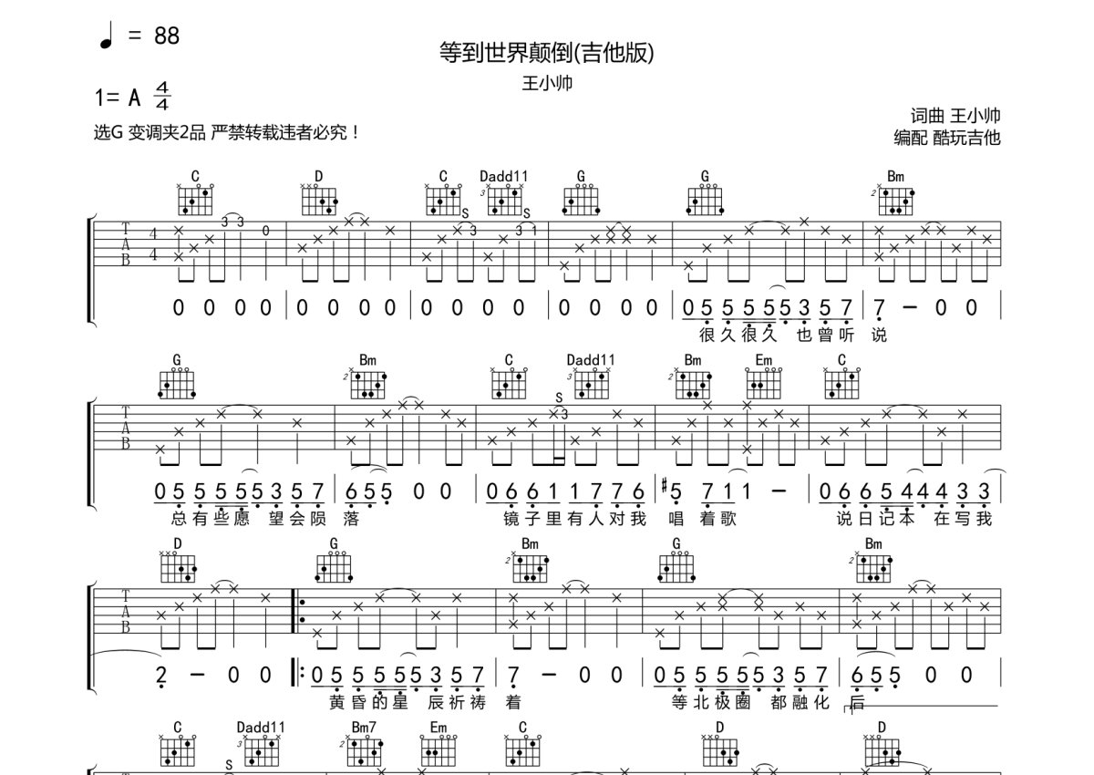 王小帅《等到世界颠倒》吉他谱 - G调弹唱六线谱 - 吉他版