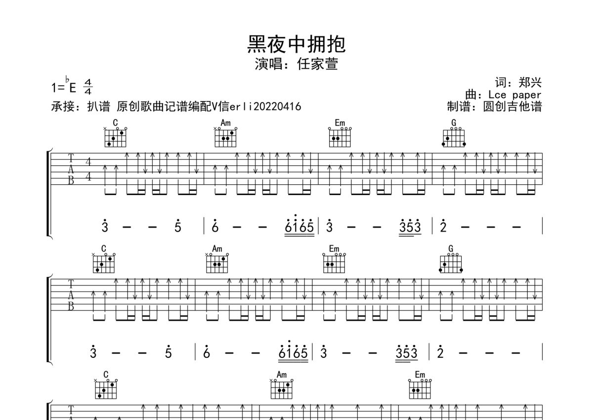 《黑夜中拥抱》是任佳萱演唱的一首歌曲,扫弦编配,本吉他谱采用的是C调指法编配,这份吉他谱共有四张高清图谱,图谱由 @圆创吉他谱 编配上传,图谱使用六线谱编配,包含吉他和弦指法、简谱以及歌词部分,使用这份黑夜中拥抱吉他谱,可以让你更加方便地掌握这首歌曲的弹唱技巧,快来尝试吧。经典歌曲 C调指法编配 适合所以吉他弹出爱好者。