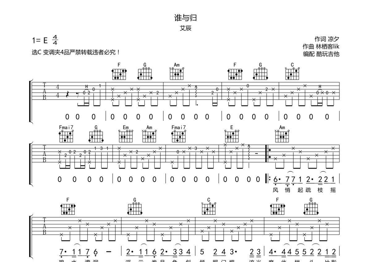 艾辰《谁与归》吉他谱 - C调弹唱六线谱
