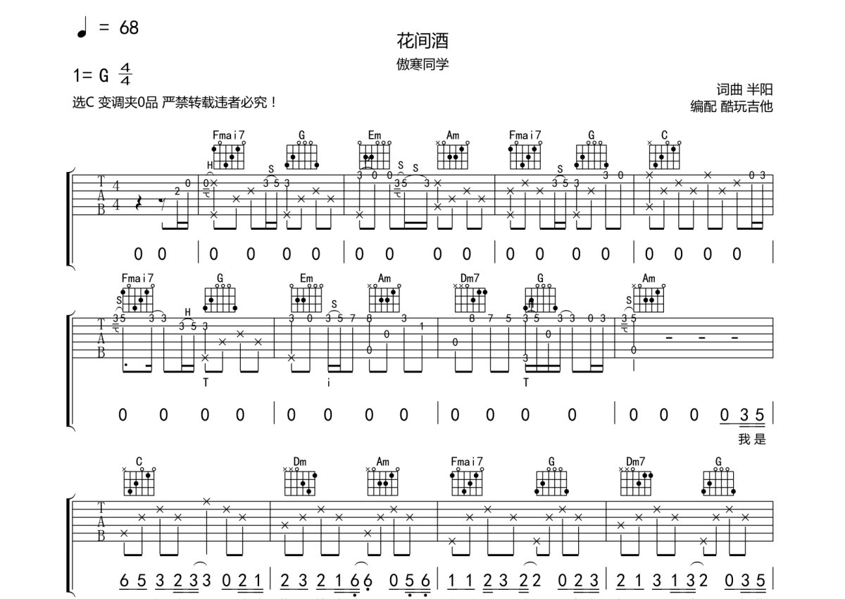 傲寒同学《花间酒》吉他谱 - C调弹唱六线谱