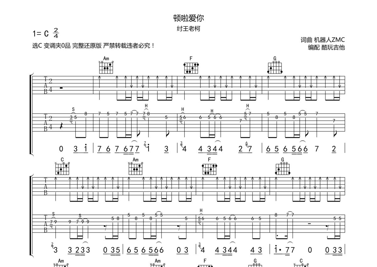 纣王老柯《顿啦爱你》吉他谱 - C调弹唱六线谱