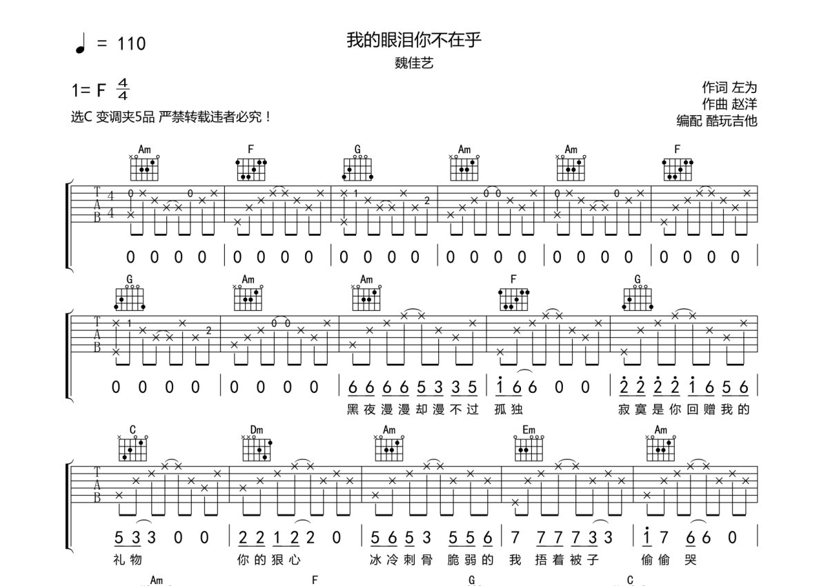 魏佳艺《我的眼泪不在乎》吉他谱 - C调弹唱六线谱